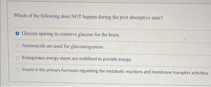 During a post-absorptive state the bodys energy needs are fulfilled from energy previously stored in the body. October 16 2019 Posted by DrSamanthi. Which of the following is NOT a postabsorptive state reaction.